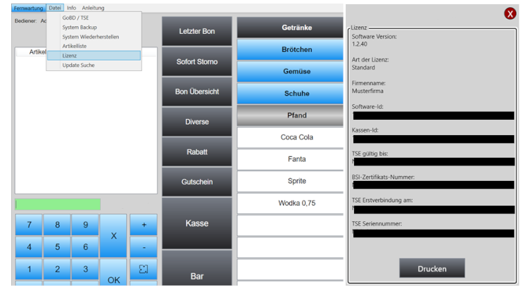 Die Daten, die Sie zum Ausfüllen benötigen, finden Sie direkt in der Kassensoftware unter Datei / Lizenz: